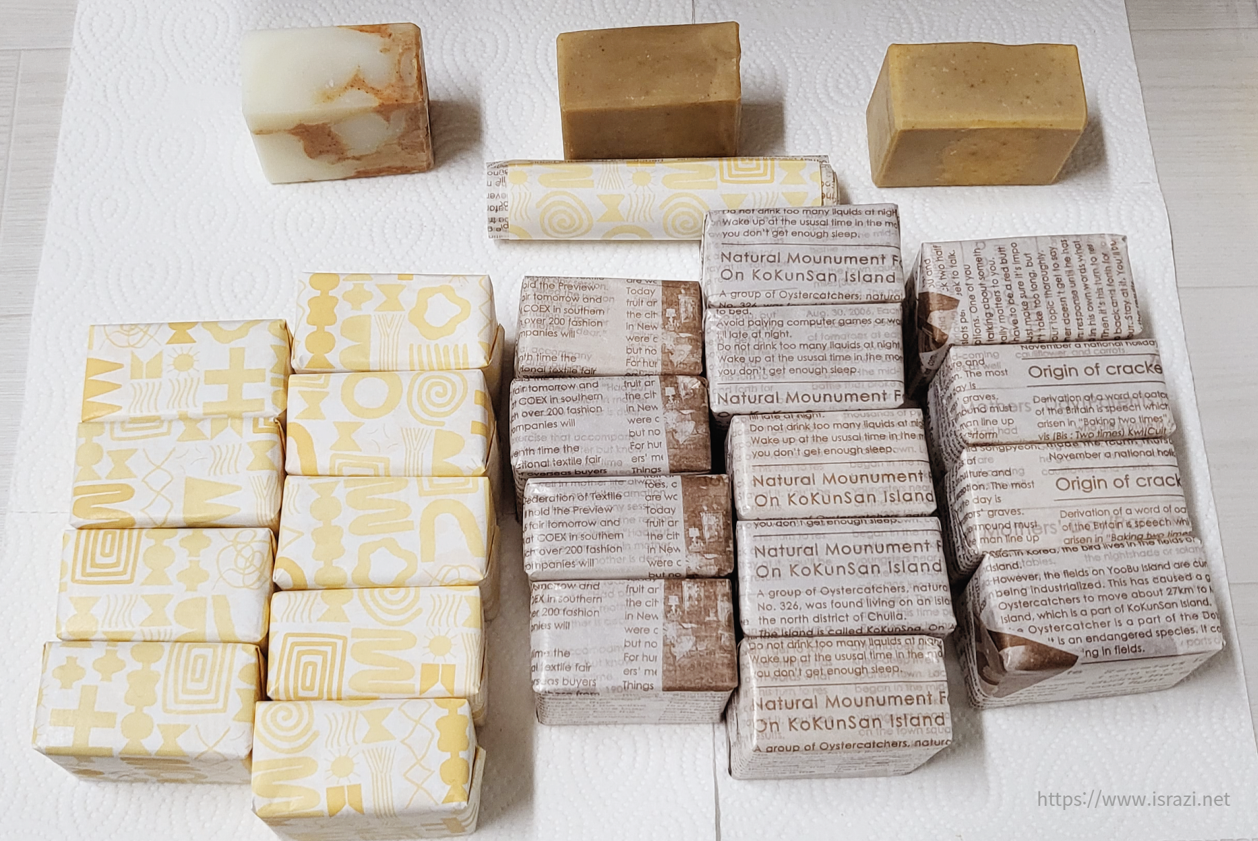 지난번에 만들어 건조 중인 비누를 포장했다.